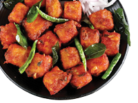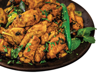 Marinated pieces coated with flour, deep fried tossed in green chillies and curry leaves