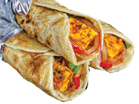 This vegetarian version is filled with barbequed paneer tikka cubes, crunchy slaw, mint chutney and pickled onions in a flour tortilla