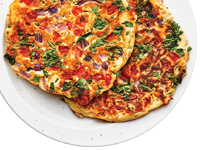 Savoury pancake with crispy golden edges and a pillowy soft centre topped with veggies and special spice powder